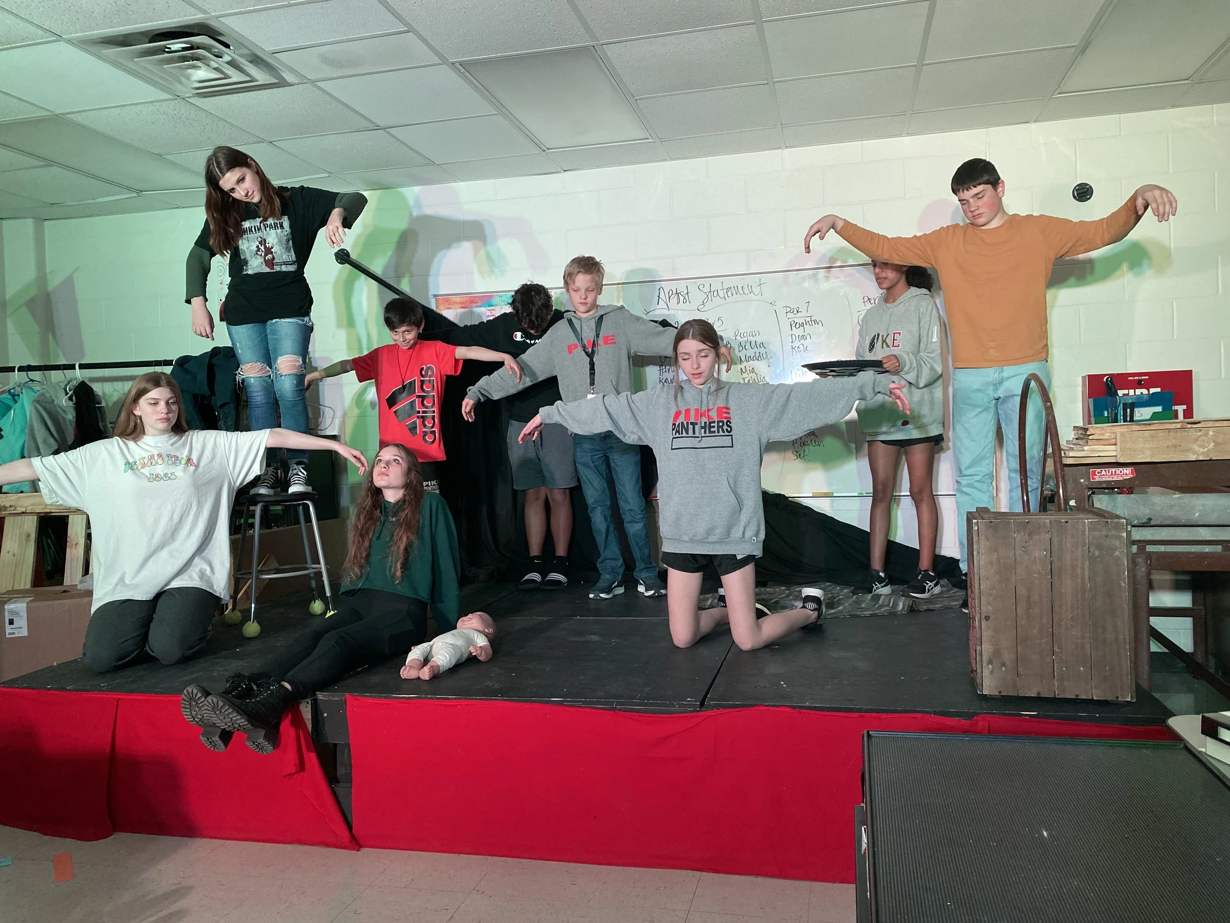 With limited physical resources and no traditional set pieces, I designed a flexible stage environment using rugs to define space and crates to build levels and shifting shapes. The cast manipulated these elements in real time, using choreographed transitions to create abstract representations of scenes such as a ship, a train car, and a café. This demanded a high level of ensemble coordination and gave the piece a sense of fluid storytelling that mirrored Edward’s journey.
